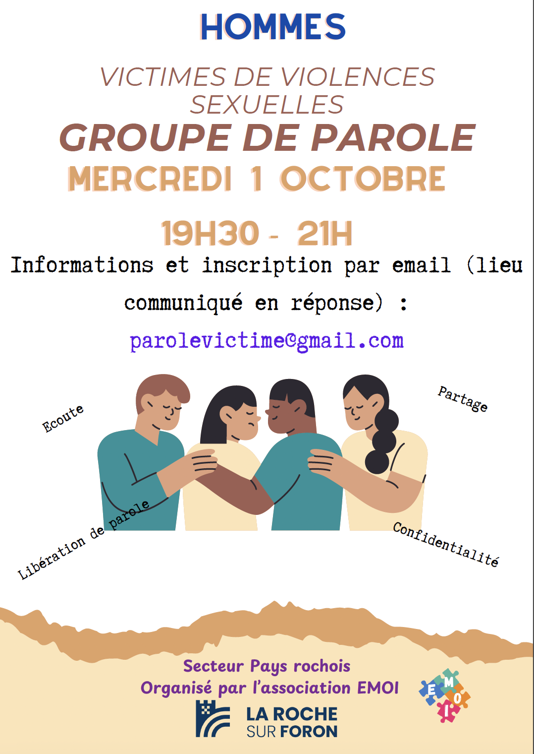 Groupe de parole pour hommes victimes de violences. Secteur Pays Rochois Organisé par l’association EMOI